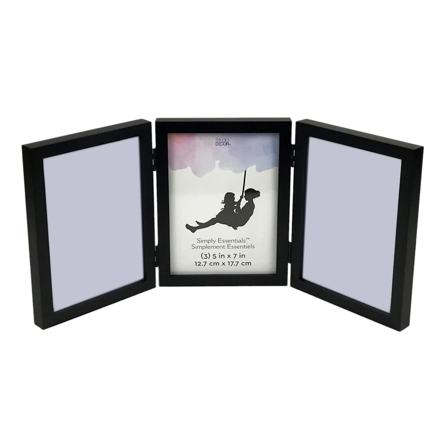 Show off a trio of family photographs. Three black frames are hinged together to create an eye-catching photo display for your desk or tabletop.