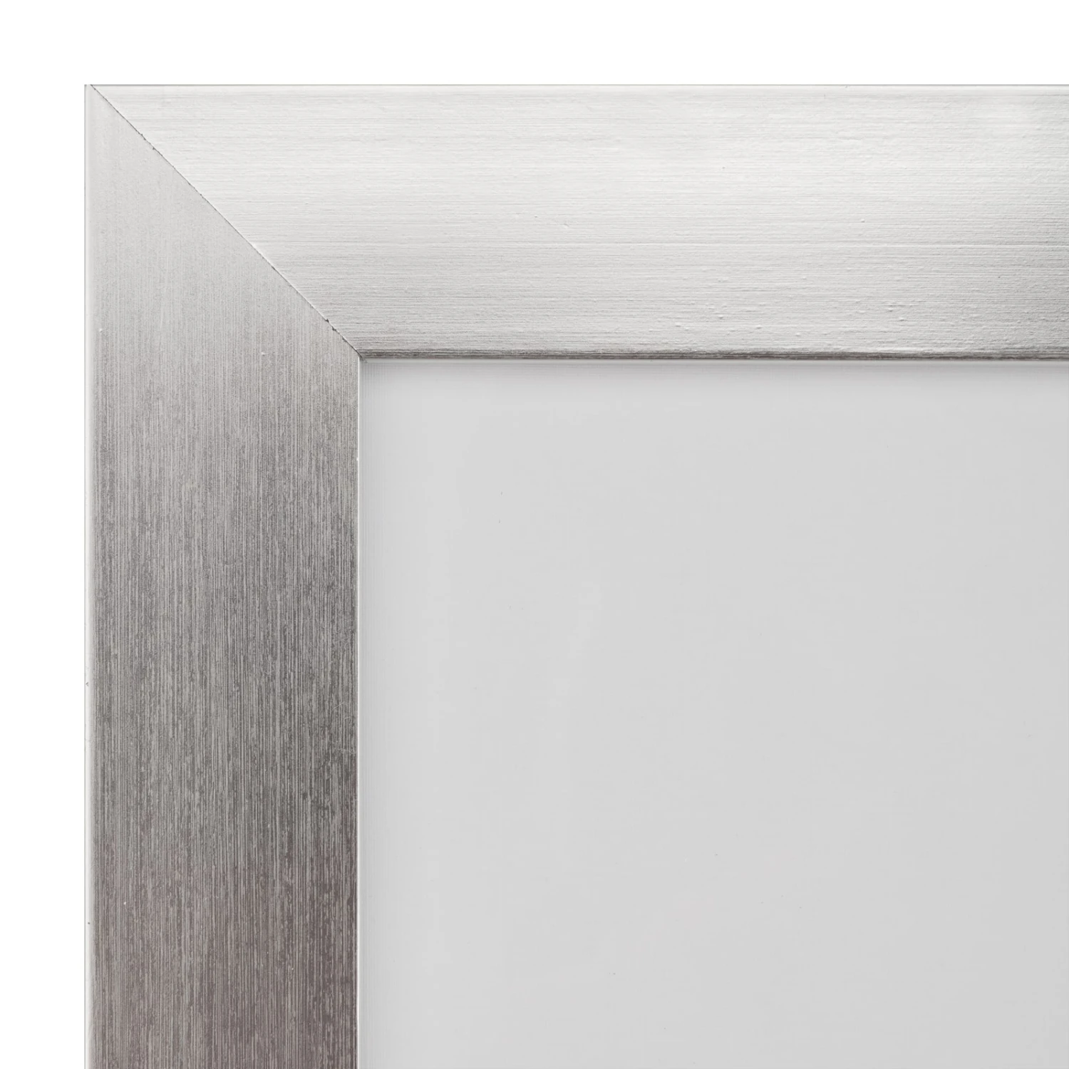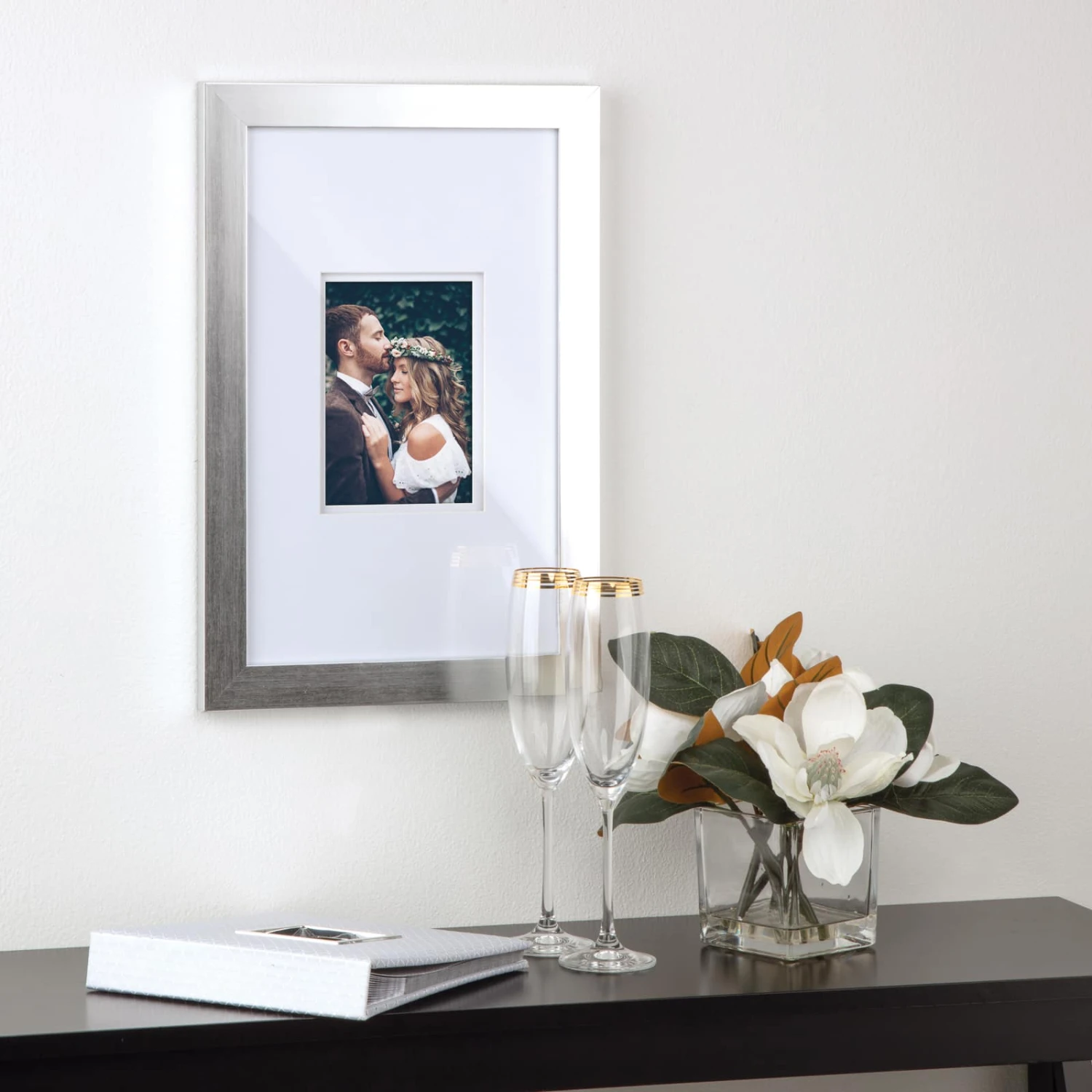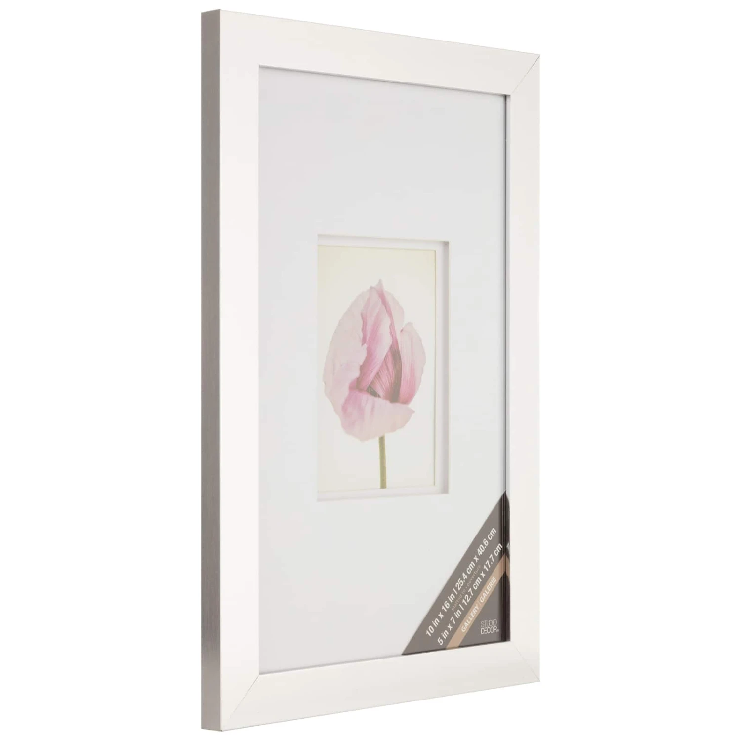 - Silver colored frame with white double mat