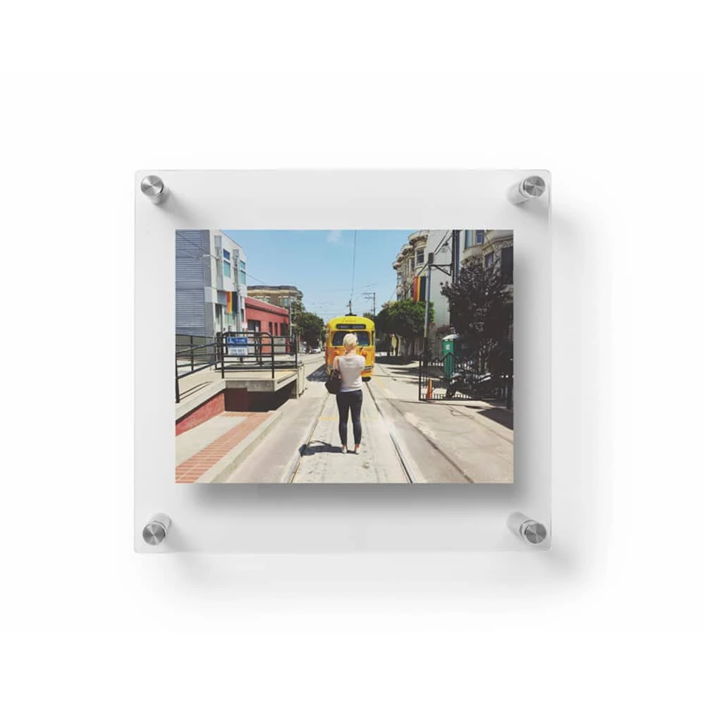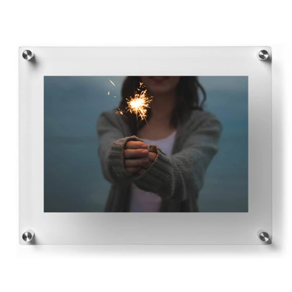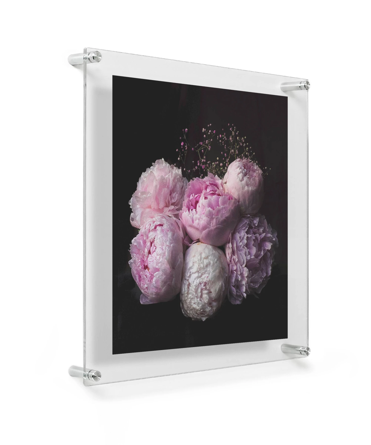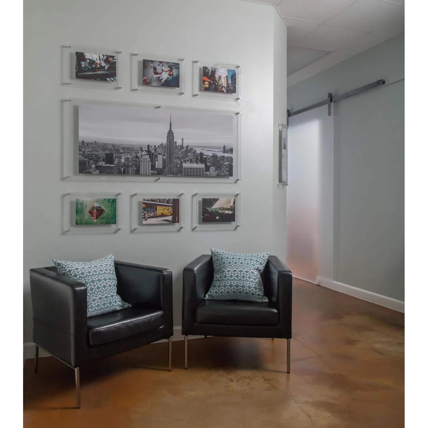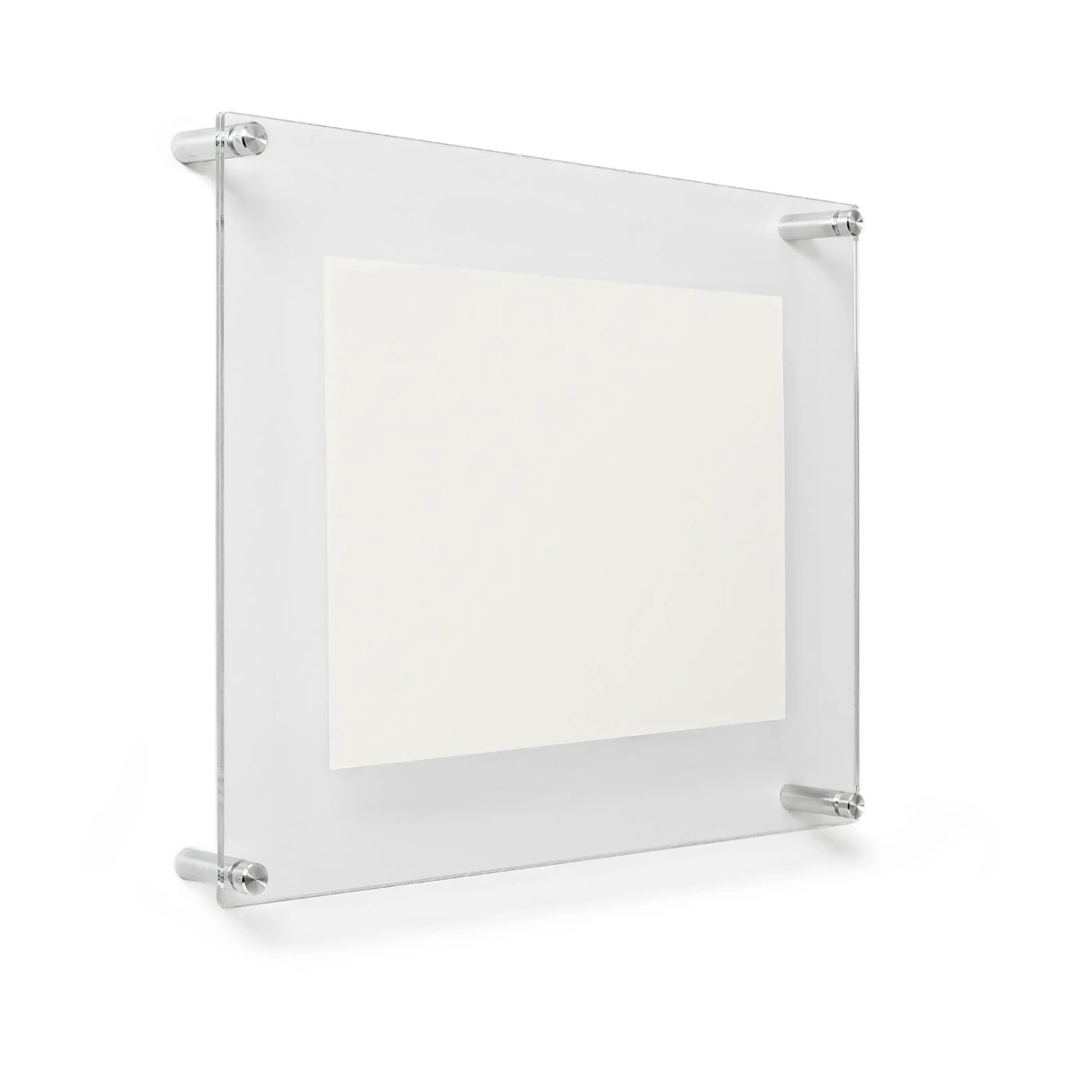 Float your artwork and photos off the wall while fully enclosing your art in between two panels of UV protected acrylic. When you want to change out your display, just unscrew the caps on the hardware and lift off the plexiglass.